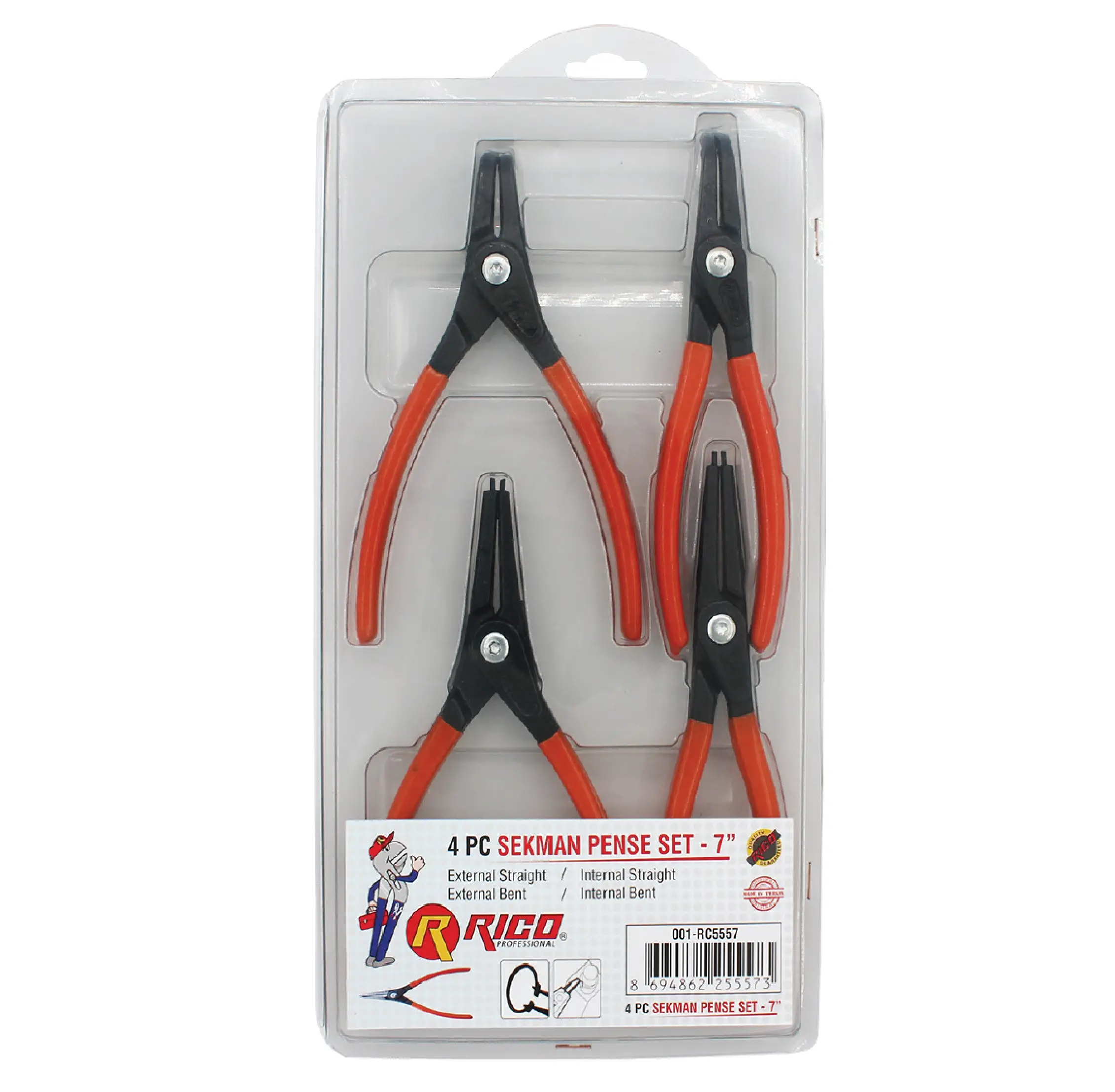 4PC Dövme Çelik Sekman Pense Seti, iç ve dış sekmanları (snap ring) takma ve çıkarma işlemleri için özel olarak tasarlanmış dört parçadan oluşan bir settir. Düz ve eğri çene çeşitleri, dar ve zor ulaşılan alanlarda maksimum hassasiyet ve kontrol sağlar.